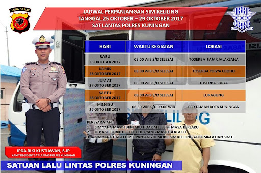 - Hari Rabu, 25 Oktober 2017, pelayanan SIM keliling berada di Toserba Fajar Jalaksana mulai pukul 08.00 sampai dengan selesai.